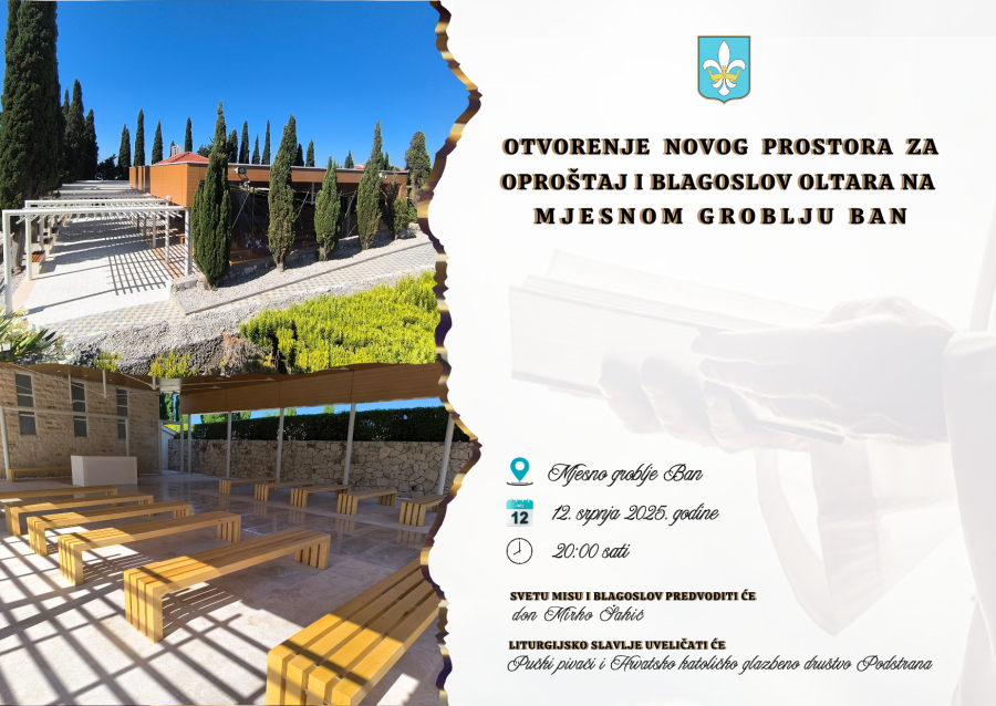 pozivamo vas da svojim prisustvom uveličate svečano otvorenje novog prostora za oproštaj te blagoslov novoizgrađenog oltara, koje će se održati u subotu 12. srpnja 2025. godine u 20:00 sati na mjesnom groblju Ban. Svetom misom i blagoslovom oltara prisjetiti ćemo se važnosti dostojanstvenog oproštaja i zajedništva u trenucima tuge, te obilježiti ovaj važan trenutak za našu zajednicu izražavajući zahvalnost svima koji su doprinijeli ostvarenju ovog vrijednog projekta.
