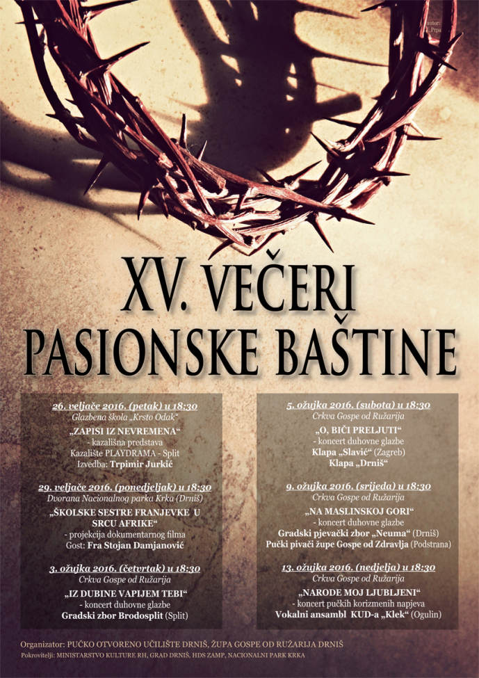 U sklopu XV. večeri pasionske baštine, održanih u Drnišu od 26. veljače do 13 ožujka, nastupili su Pučki pivači župe Gospe od Zdravlja iz Podstrane. Dio nastupa naših pivača možete poslušati na amaterskoj snimci.