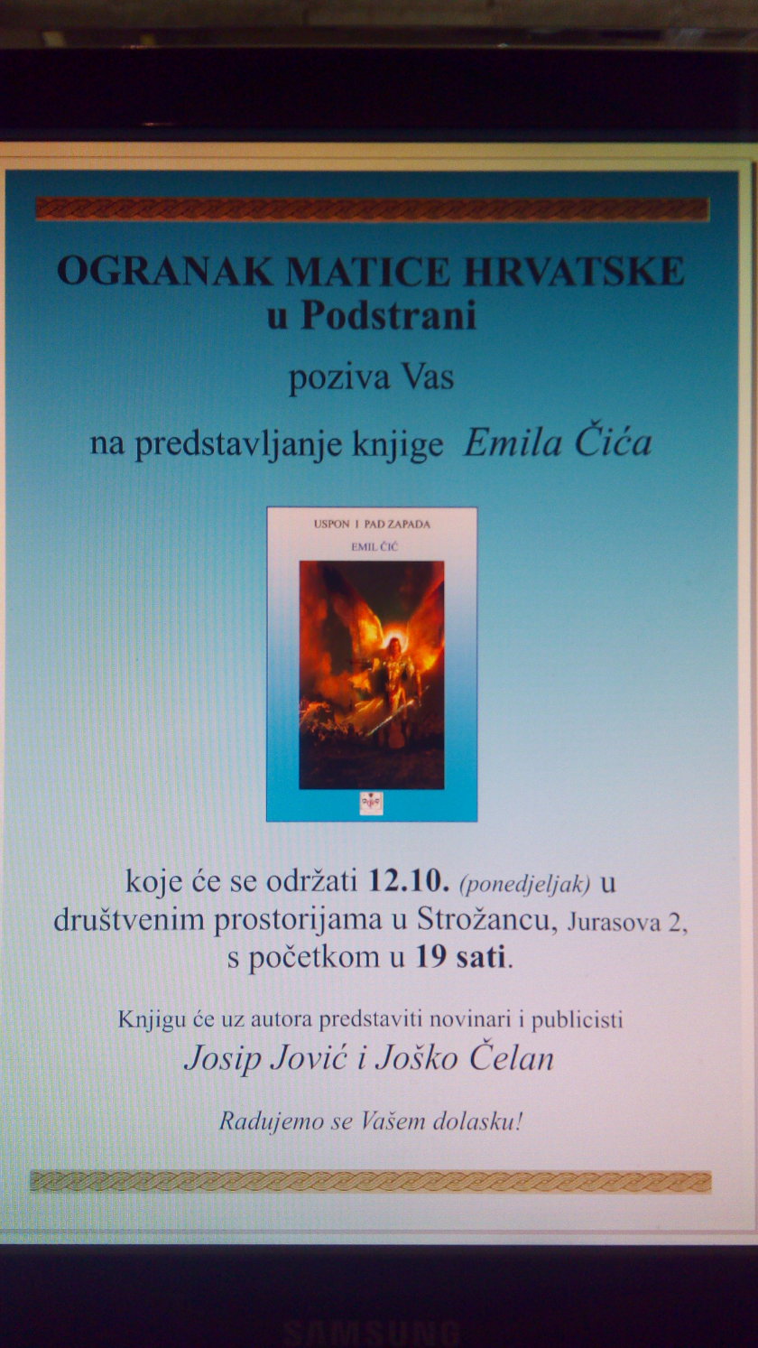 Knjiga “Uspon i pad Zapada” koja je inspirirana knjigom Oswalda Spenglera, govori o Propasti Zapada, a predstavlja se u Podstrani dana 12. listopada u društvenim prostorijama u Strožancu (lučica), uz publiciste i novinare Josipa Jovića i Joška Čelana i samog autora Emila Čića.