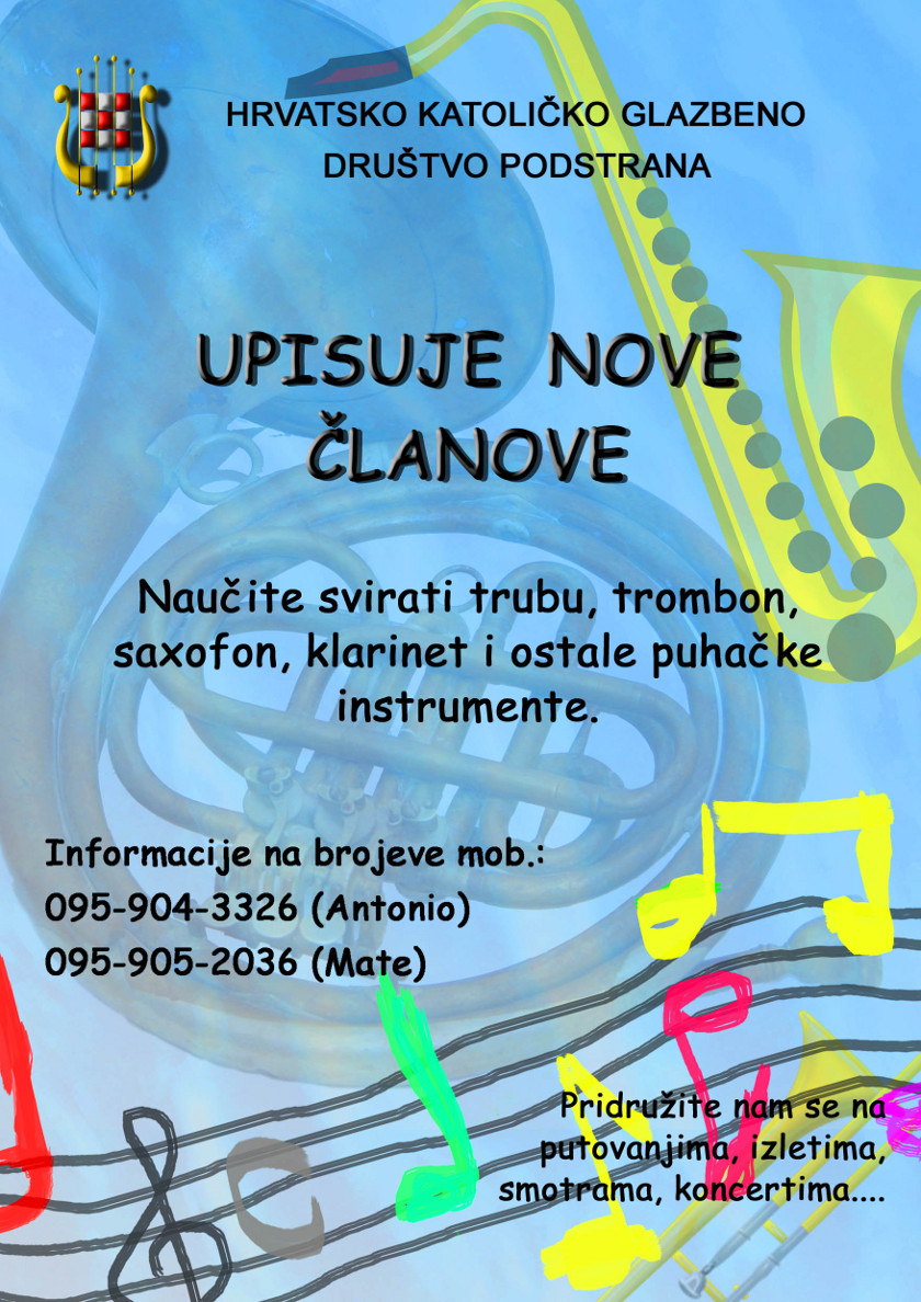 Hrvatsko katoličko glazbeno društvo „Podstrana“ upisuje nove članove. Pridružite se svi vi koji želite svirati neki od puhačkih instrumenata.