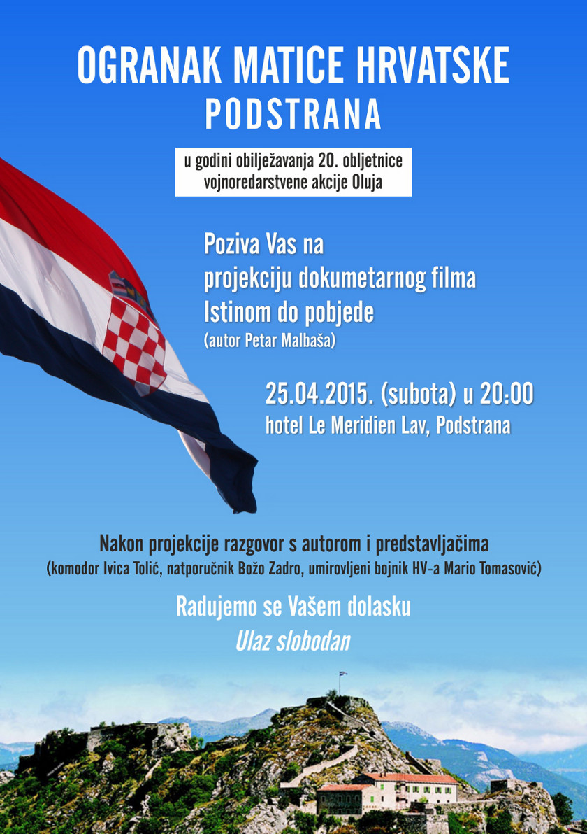 U hotelu Le Meridien Lav 25. travnja, pred stotinjak nazočnih, većinom branitelja Domovinskog rata održano je prikazivanje dokumentarnog filma Istinom do pobjede, ratnog snimatelja Petra Malbaše.